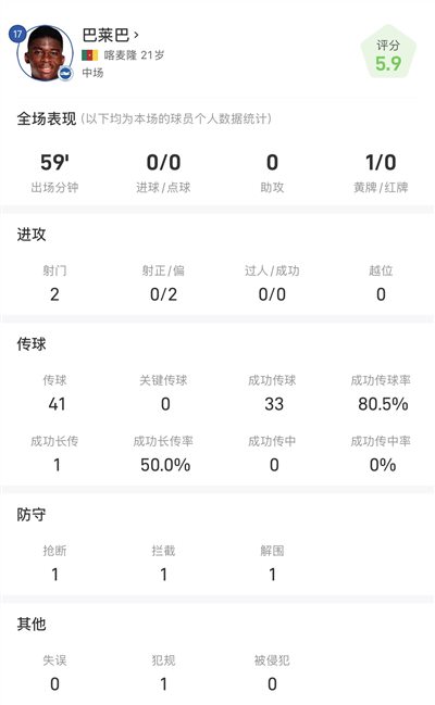 巴莱巴战曼联数据:首发出战59分钟,传接胜利率80.5%