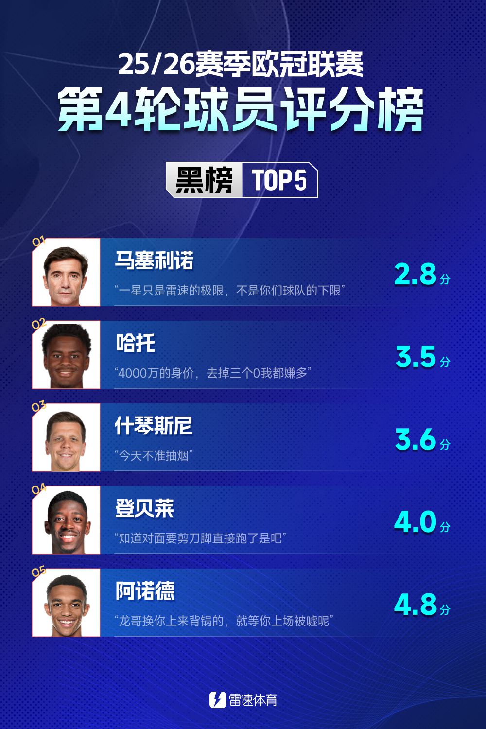 欧冠联赛事阶段第4轮今晨全部终结,多场焦点大战令人直呼过瘾,不少豪门翻车也让人大跌眼镜。各位老哥也给自己心中表现最佳/最差的球员送上了评分和犀利的点评,让我们一起来看看今天的欧冠红黑榜吧~