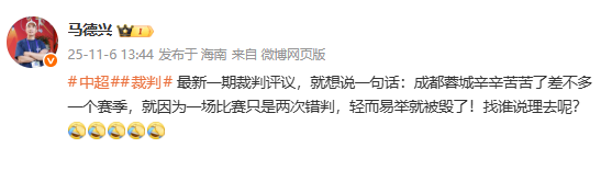 马德兴:成都蓉城辛苦一个赛季让两个误判毁了,找谁说理去