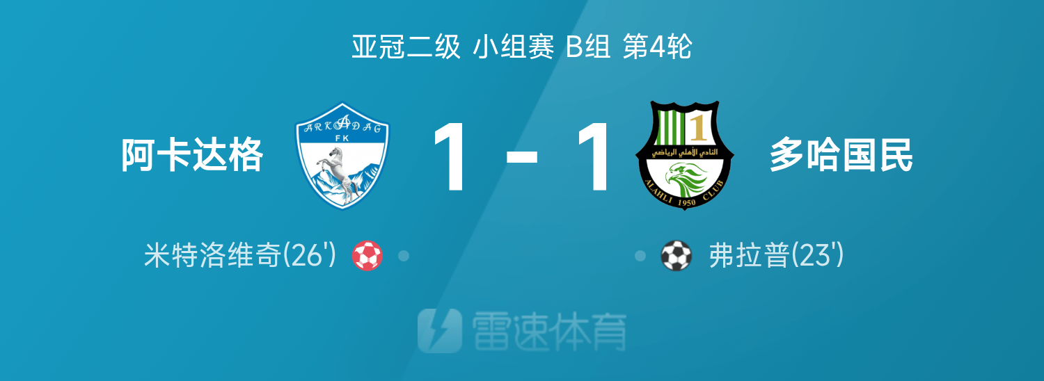 亚冠二级战报:米特洛维奇顶球乌龙,阿卡达格1-1多哈国民