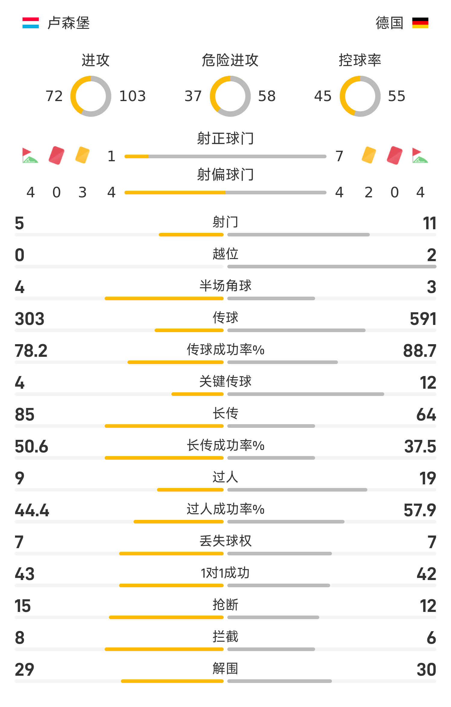 卢森堡首发阵容:1-莫里斯、18-扬斯、4-博纳特(46’22-马丁斯)、13-卡尔森、2-科拉克、8-马丁斯(79’5-库尔奇)、15-蒂尔(71’6-克鲁兹)、16-巴雷罗、19-奥尔森(79’3-恩巴洛)、7-达达里(88’21-希尔)、10-塞纳尼