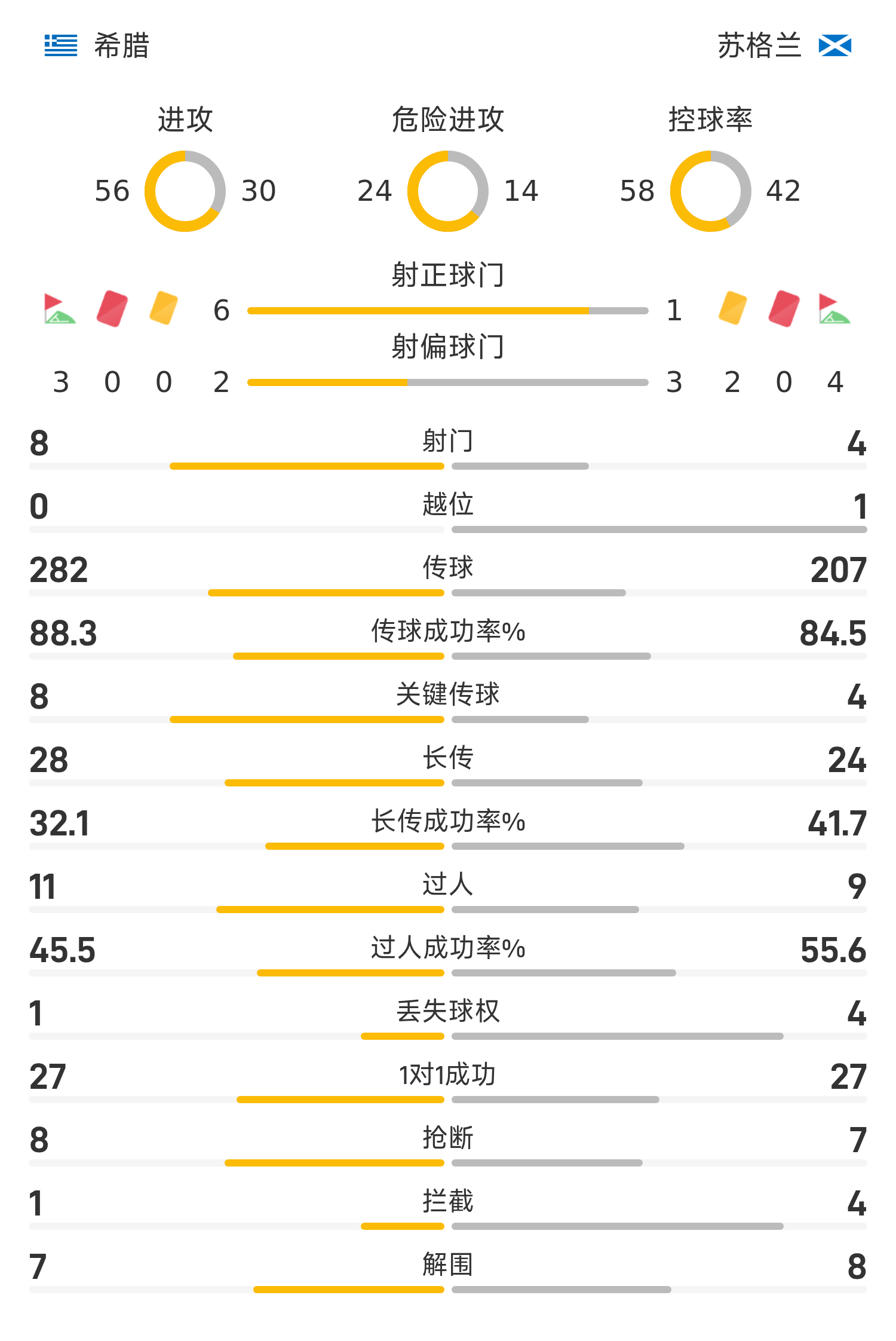 27’希腊前场边线球开出,雷索斯甩头攻门遭戈登神扑