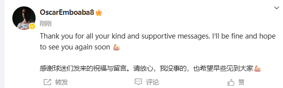 感谢球迷们发来的祝福与留言。请放心,我没事的,也期望早些见到大家