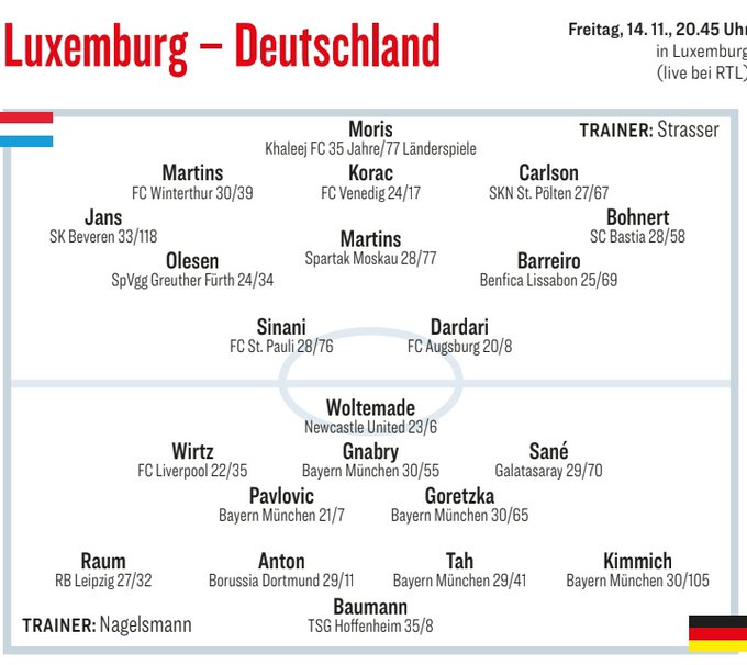 6686体育11月13日讯 世杯赛资格赛欧洲区分组赛,德国队将客队场挑战卢森堡队。赛前,德国体育媒体《踢球者》预测了本场竞赛德国队的首发阵容。其中,效力于纽卡斯尔的五号位沃尔特马德出现在单箭头位置,在利物浦表现挣扎的维尔茨获得首发机会,出现在左边路前锋位置,重返国家队的萨内出现在右边路前锋位置。