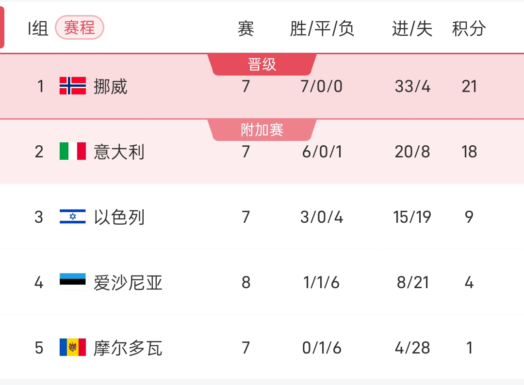 北京时间明日凌晨3:45,意大利将在主队场迎来与挪威的再次交手。目前挪威领跑位意大利3分且有多达17个净胜球的优势,也意味着意大利必须净胜9球以上才能逆转局对手升入小组第一,这基本是不可能完成的任务。可以说,挪威已经无限接近直通世杯赛,而意大利预计将连续第三次进入附加赛。