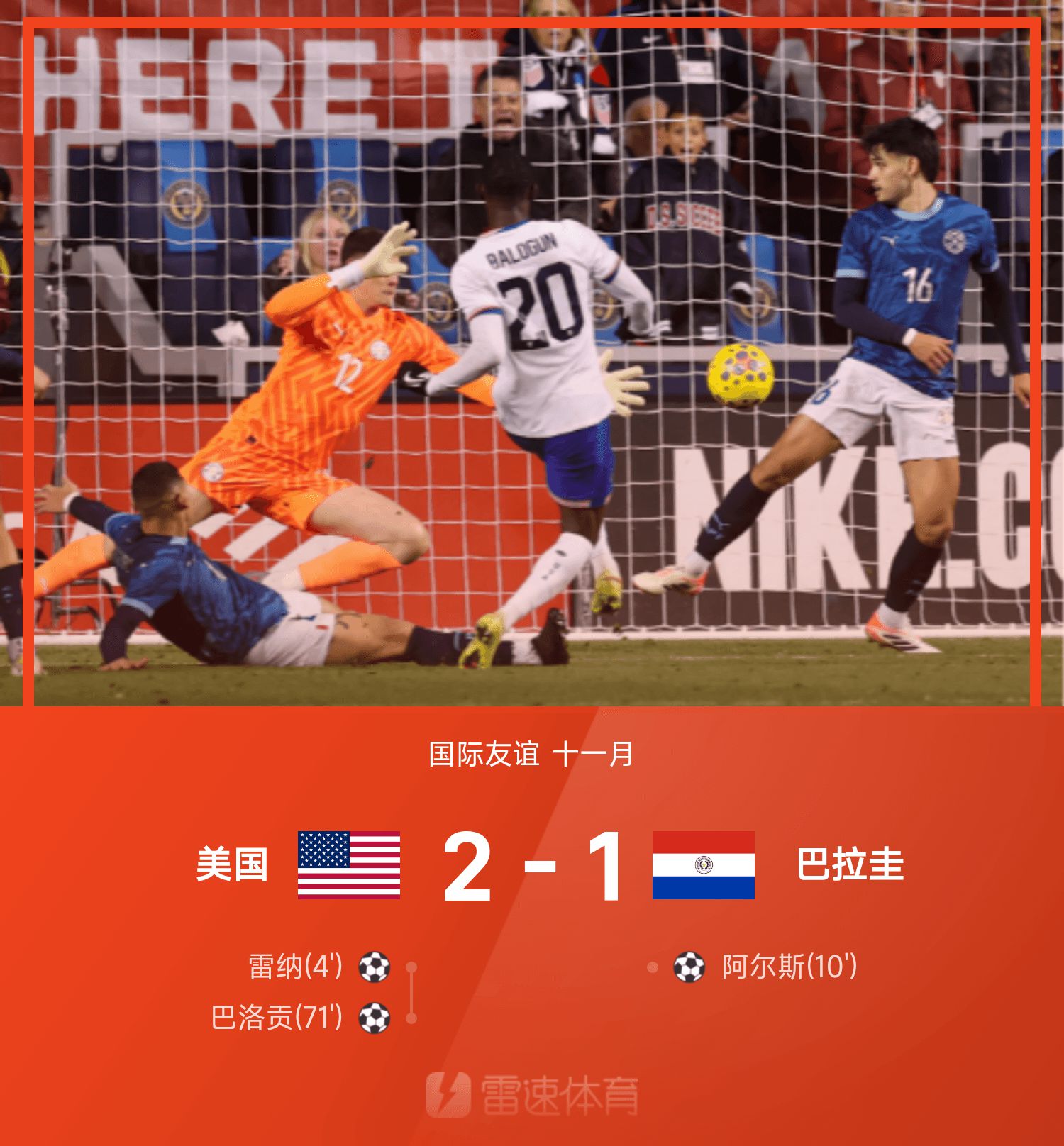 6686体育11月16日讯 国际友谊赛迎来一场对决,美国主队场对阵巴拉圭。美国队方面,巴洛贡、雷纳分别破门建功,而巴拉圭方面阿尔斯破门难救主,最终美国2-1击败巴拉圭。