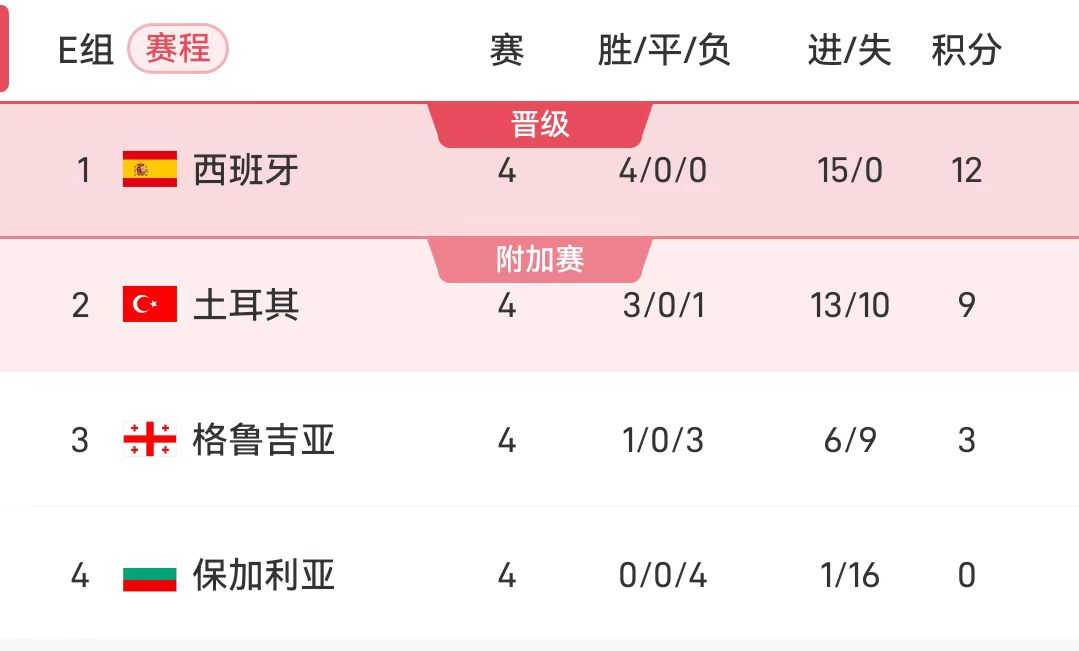 随后进行的E组竞赛中,西班牙将面对格鲁吉亚,土耳其将迎战格鲁吉亚。目前领跑位3分的西班牙,若本轮取胜且土耳其未能全取三分球,也将提前一轮进军美加墨。