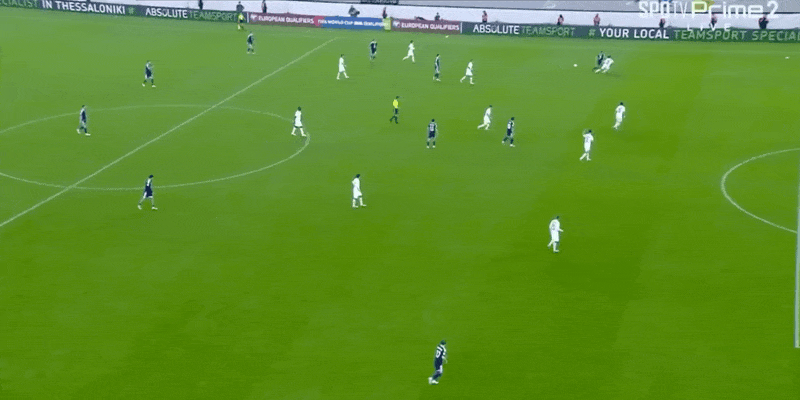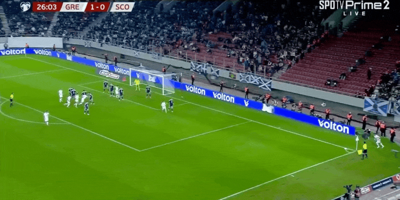 27’希腊前场边线球开出,雷索斯甩头攻门遭戈登神扑