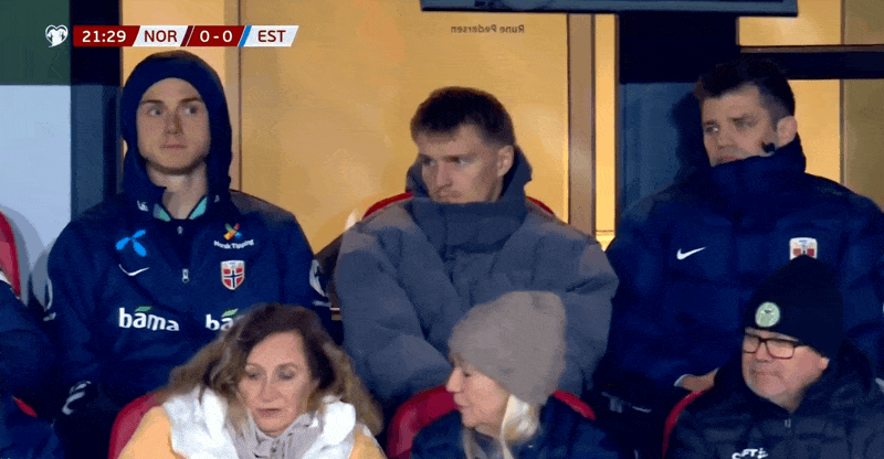 22’转播镜头给到因伤缺席在看台上观战的挪威中场厄德高