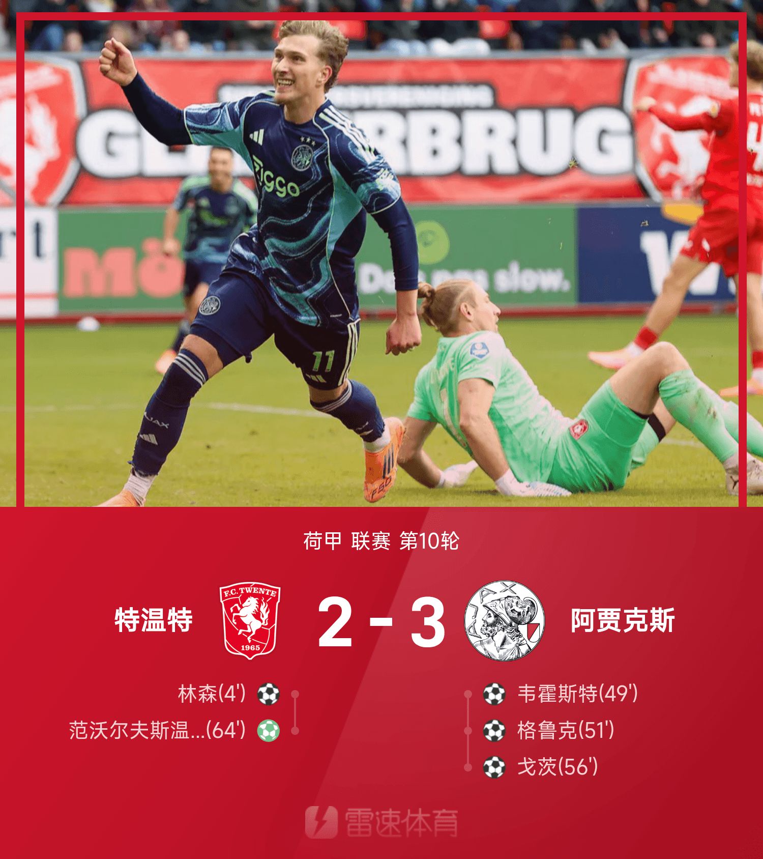 荷甲战报:戈茨传射,韦霍斯特建功,阿贾克斯3-2逆转特温特