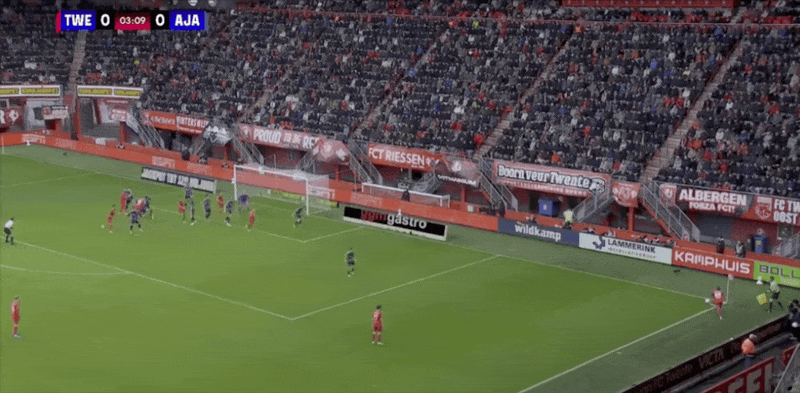 13’特温特开出战略边线球,范沃尔夫斯温克尔后点顶球偏出立柱