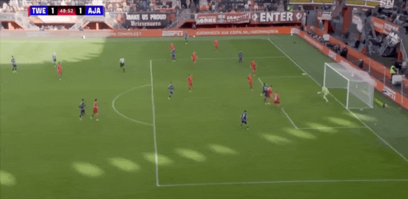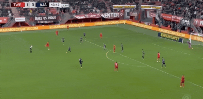 18’韦霍斯特三秒区内转身运球打出阿贾克斯全场第一脚攻门