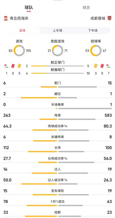 青岛西海岸vs成都蓉城全场数据: