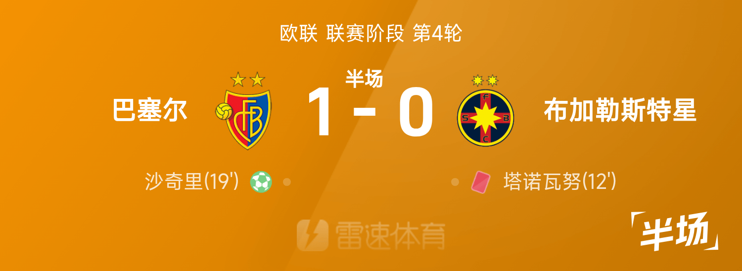 欧联半场:沙奇里点射建功,塔诺瓦努染红,巴塞尔1-0星队