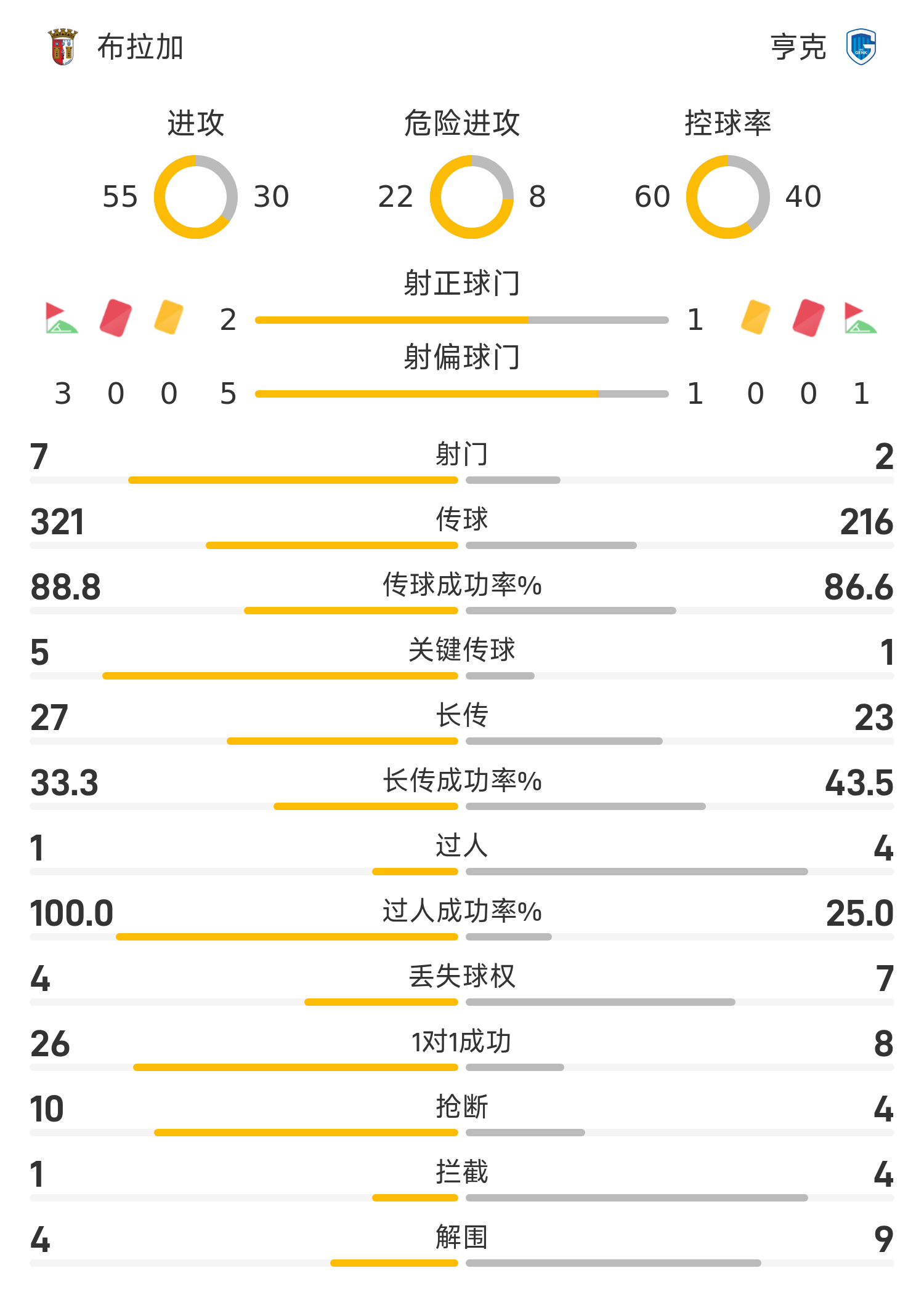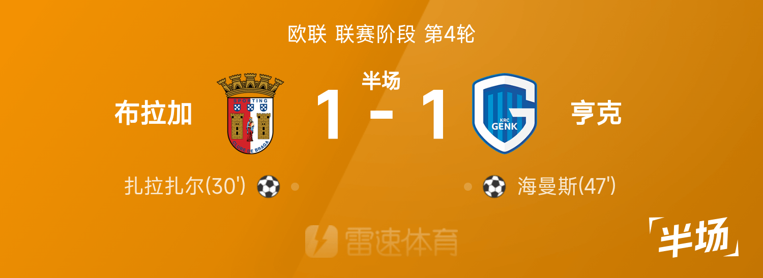 6686体育11月07日讯 25/26赛季欧联联赛事阶段第4轮,布拉加迎战亨克。半场战罢,双方赛果分暂为布拉加1-1亨克,扎拉扎尔、海曼斯破门建功。