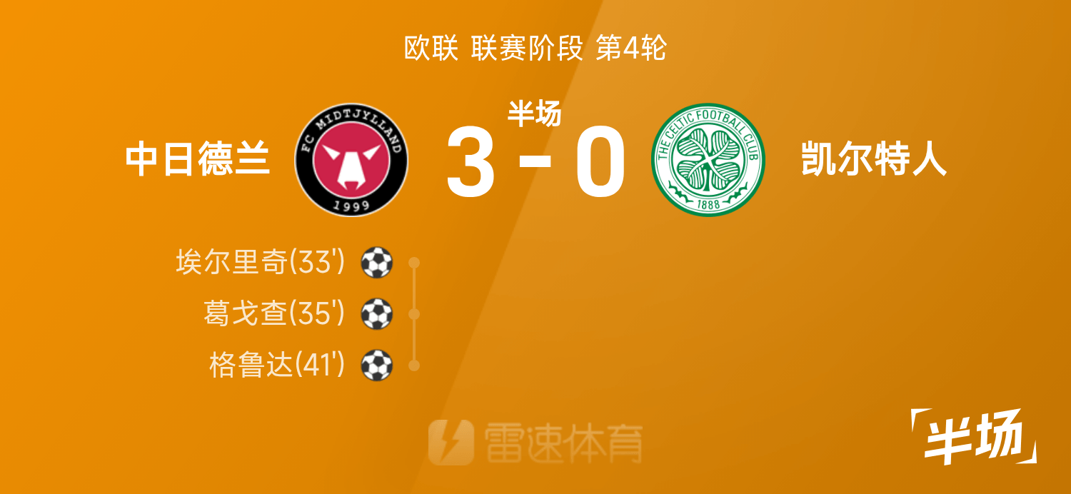 6686体育11月07日讯 25/26赛季欧联联赛事阶段第4轮,中日德兰迎战凯尔特人。半场战罢,双方赛果分暂为中日德兰3-0凯尔特人,葛戈查发挥出色贡献1射1传。