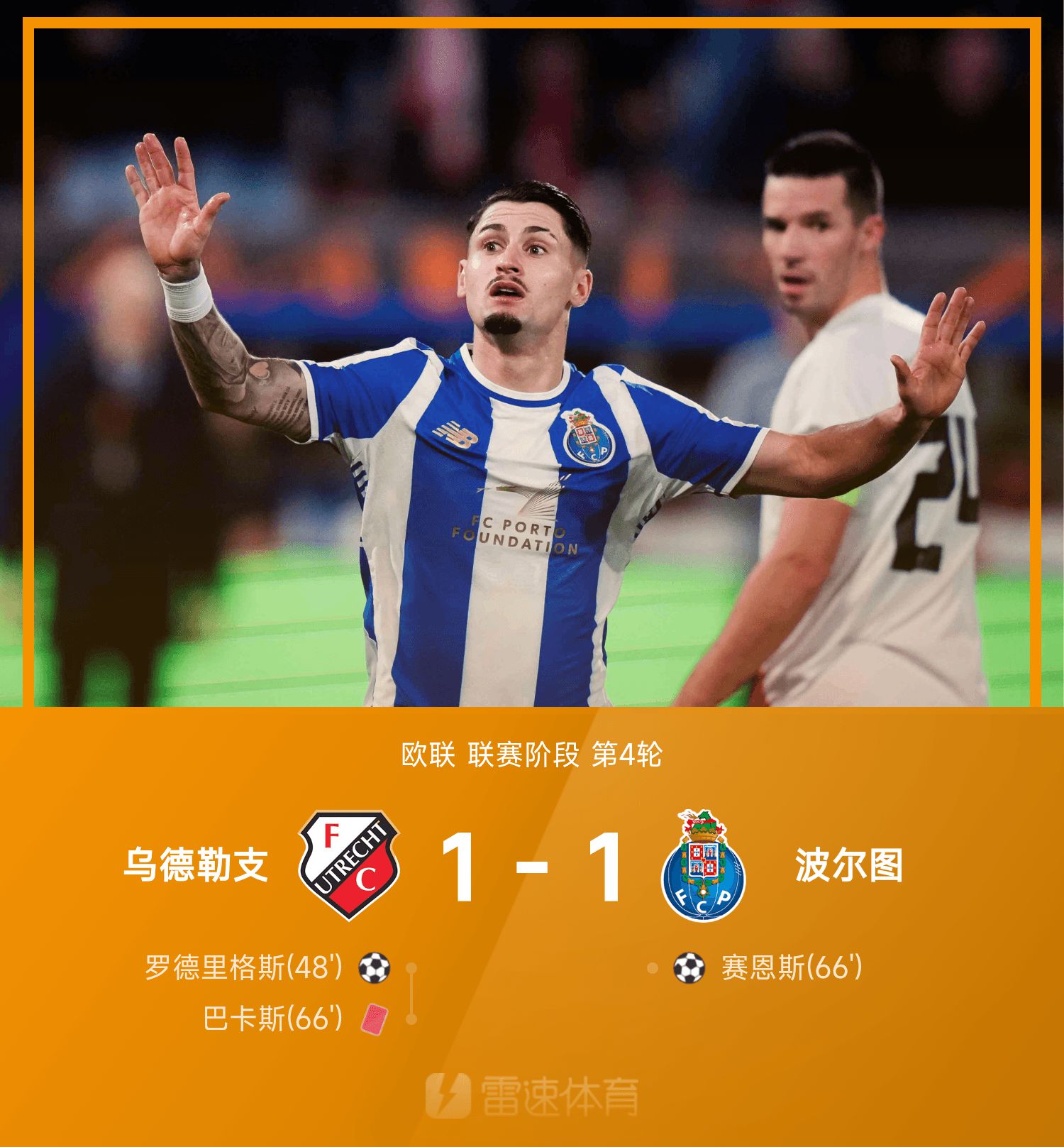 6686体育11月07日讯 25/26赛季欧联联赛事阶段第4轮,乌德勒支对战波尔图。上半场,双方均无建树。下半场,第48分钟,罗德里格斯建功打破僵局。赛恩斯空门兜射扳平赛果分。期间,乌德勒支守门员巴卡斯与波尔图球员发生争执被罚下牌罚下,乌德勒支以十人应战。最终,十人乌德勒支1-1战平波尔图,双方握手言和,竞赛终结。