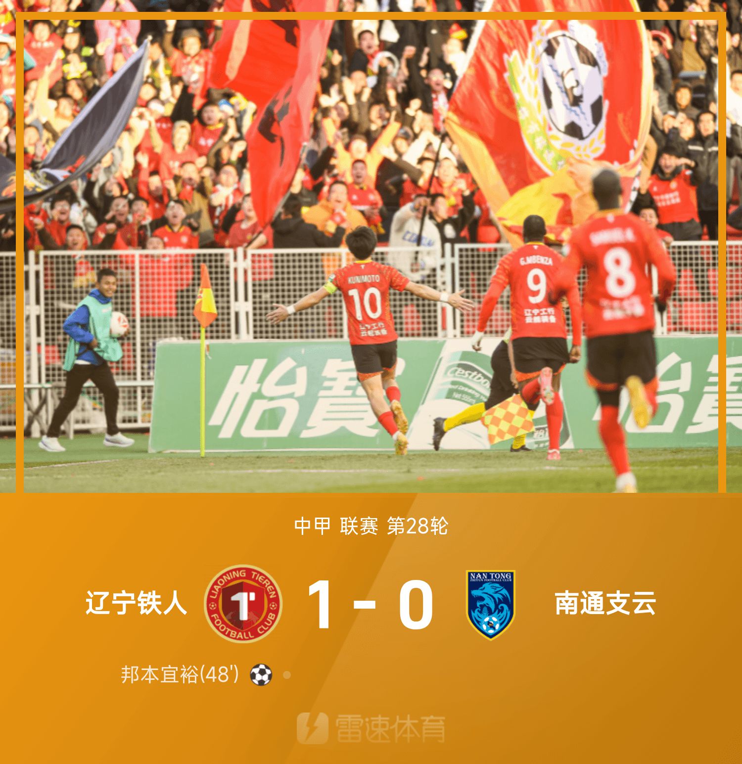 中甲战报:邦本宜裕破门,辽宁1-0南通锁定冠军胜利冲超