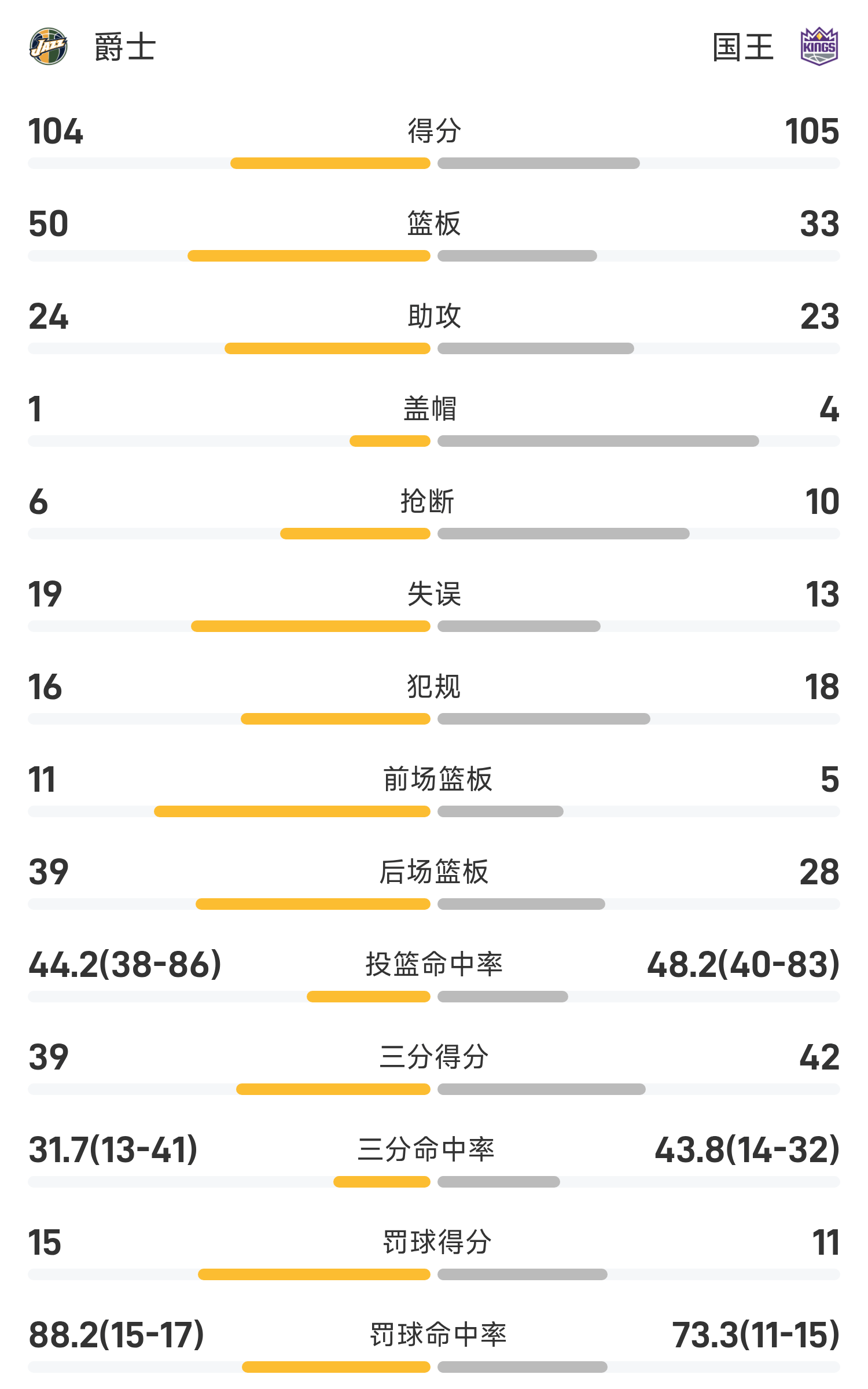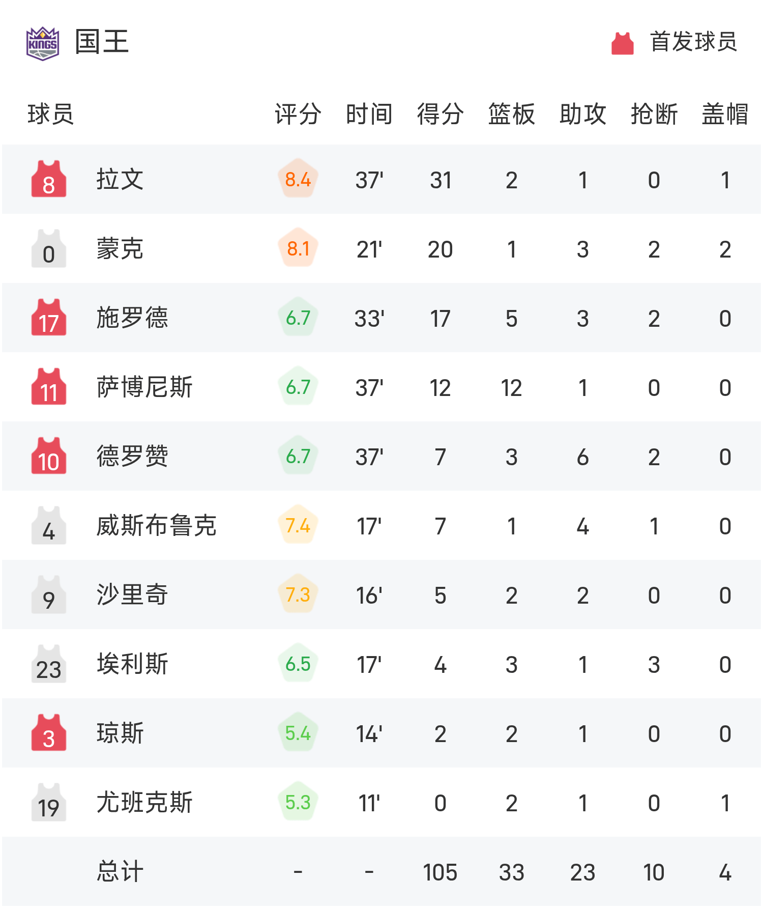NBA战报:拉文31分,国王105-104险胜爵士