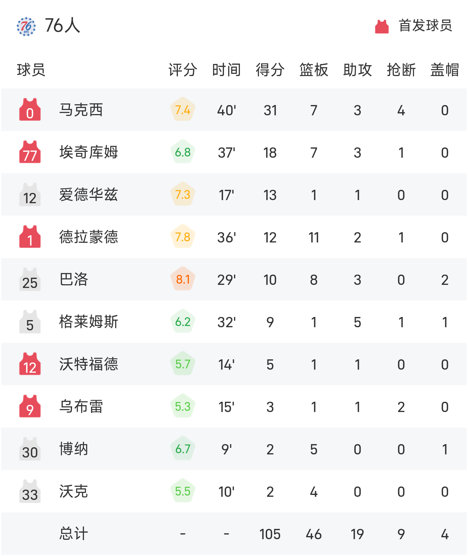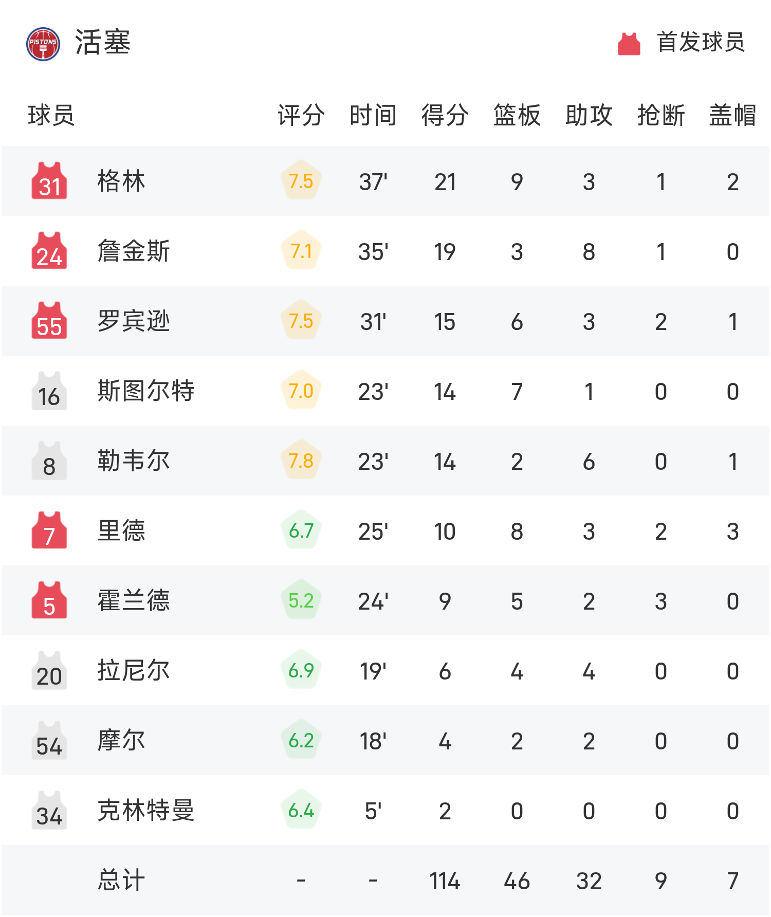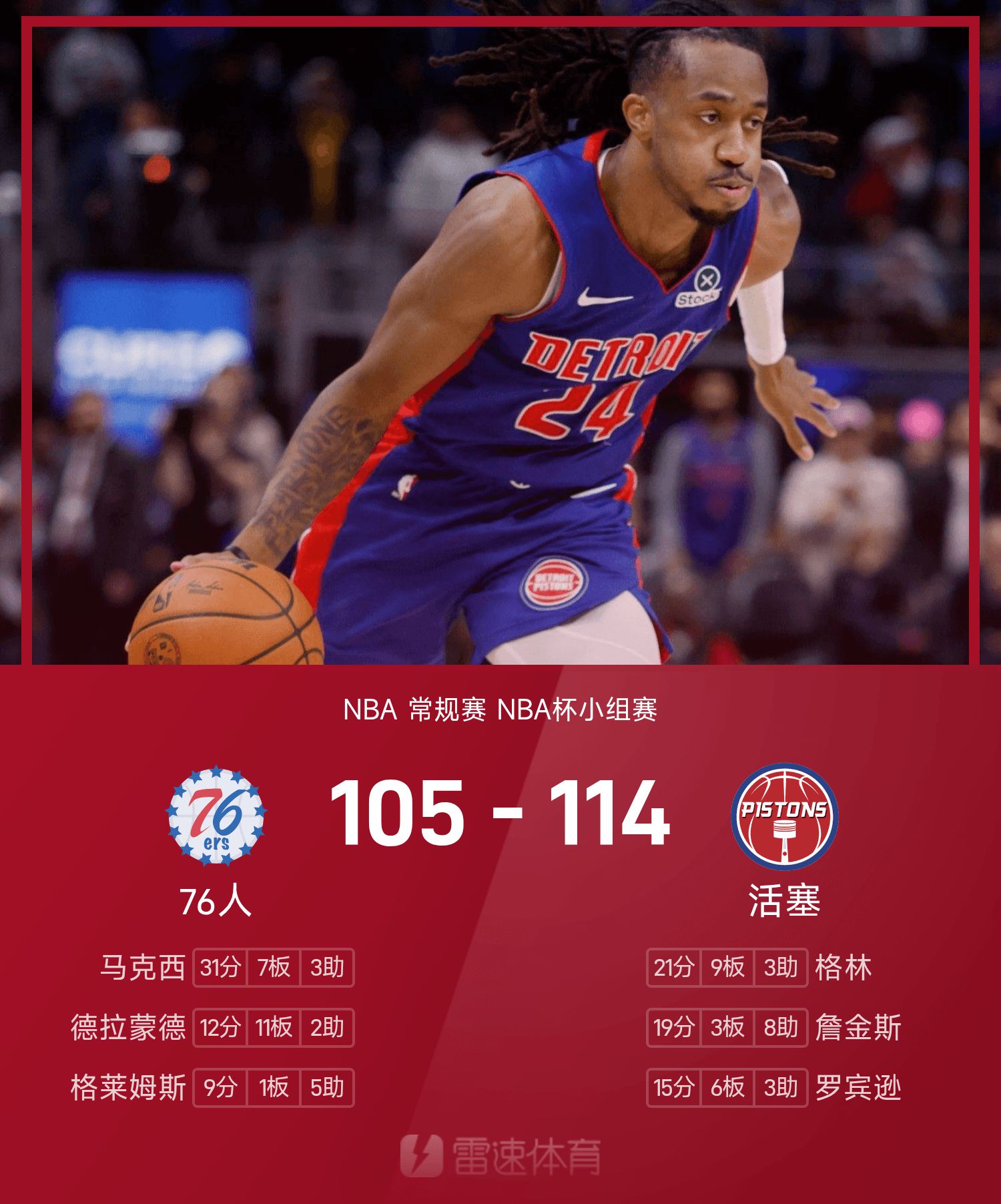 6686体育11月15日讯 25/26赛季NBA 常规赛 NBA杯分组赛,活塞对阵76人。双方全场战罢,活塞114-105战胜76人。格林得到21分9板3助率队取胜,马克西空砍全场最高的31分7板3助。