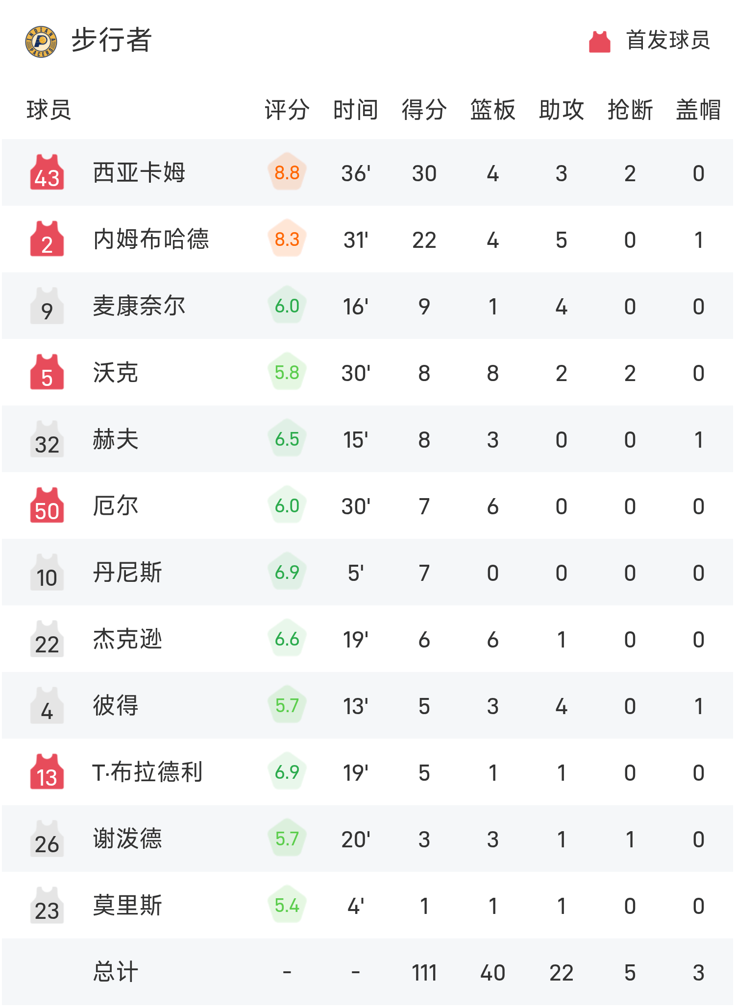 巴雷特得到22分6板4助率队取胜,西亚卡姆空砍全场最高的30分4板3助。