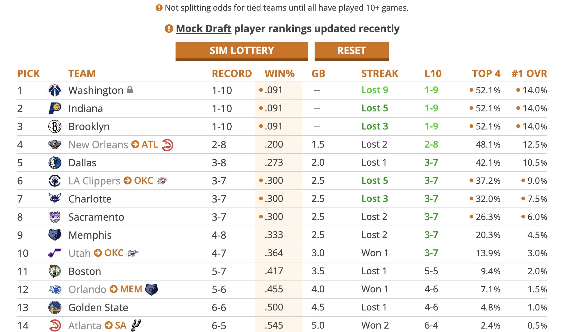 6686体育11月12日讯 美媒Tankathon根据当前联盟各队的战绩,今日更新了2026年选秀抽签的概率,奇才、步行者、篮网三队由于战绩都是1胜10负,抽到状元签的概率都是14%,抽到前四顺位的概率为52.1%。