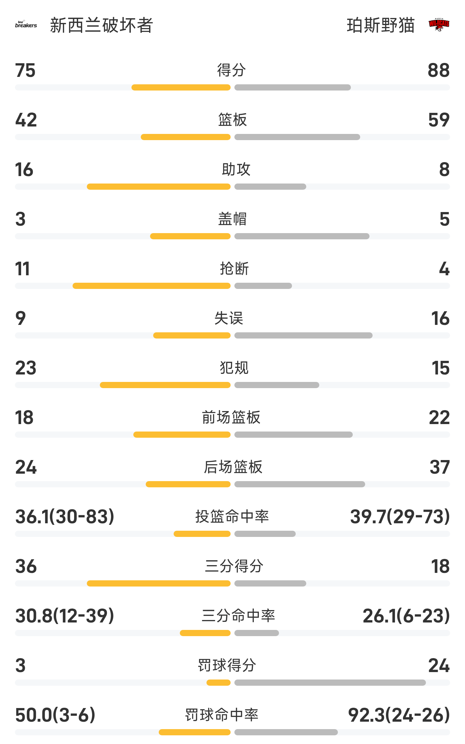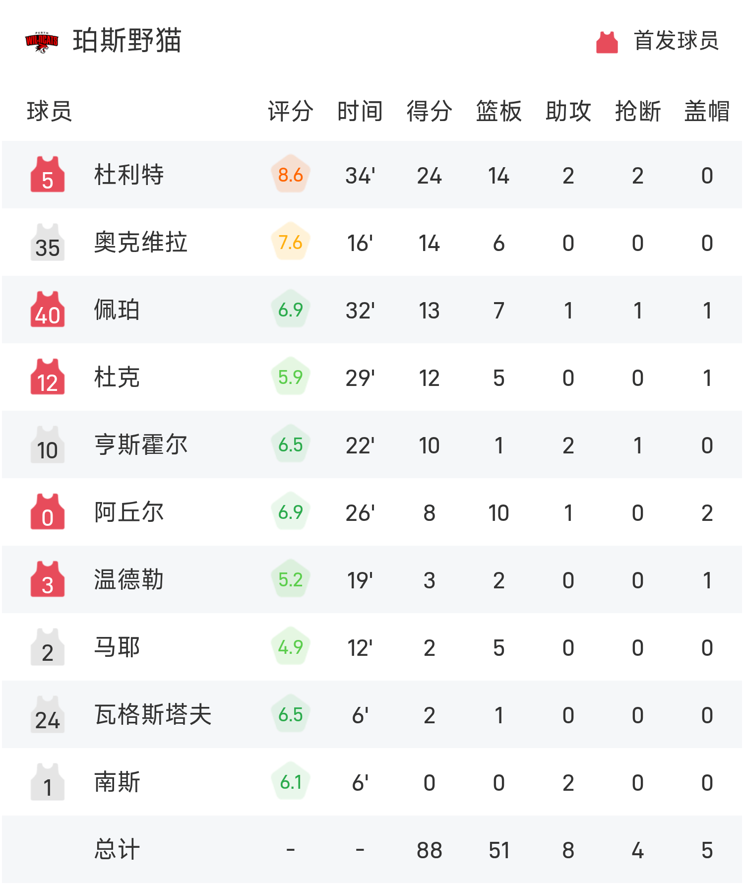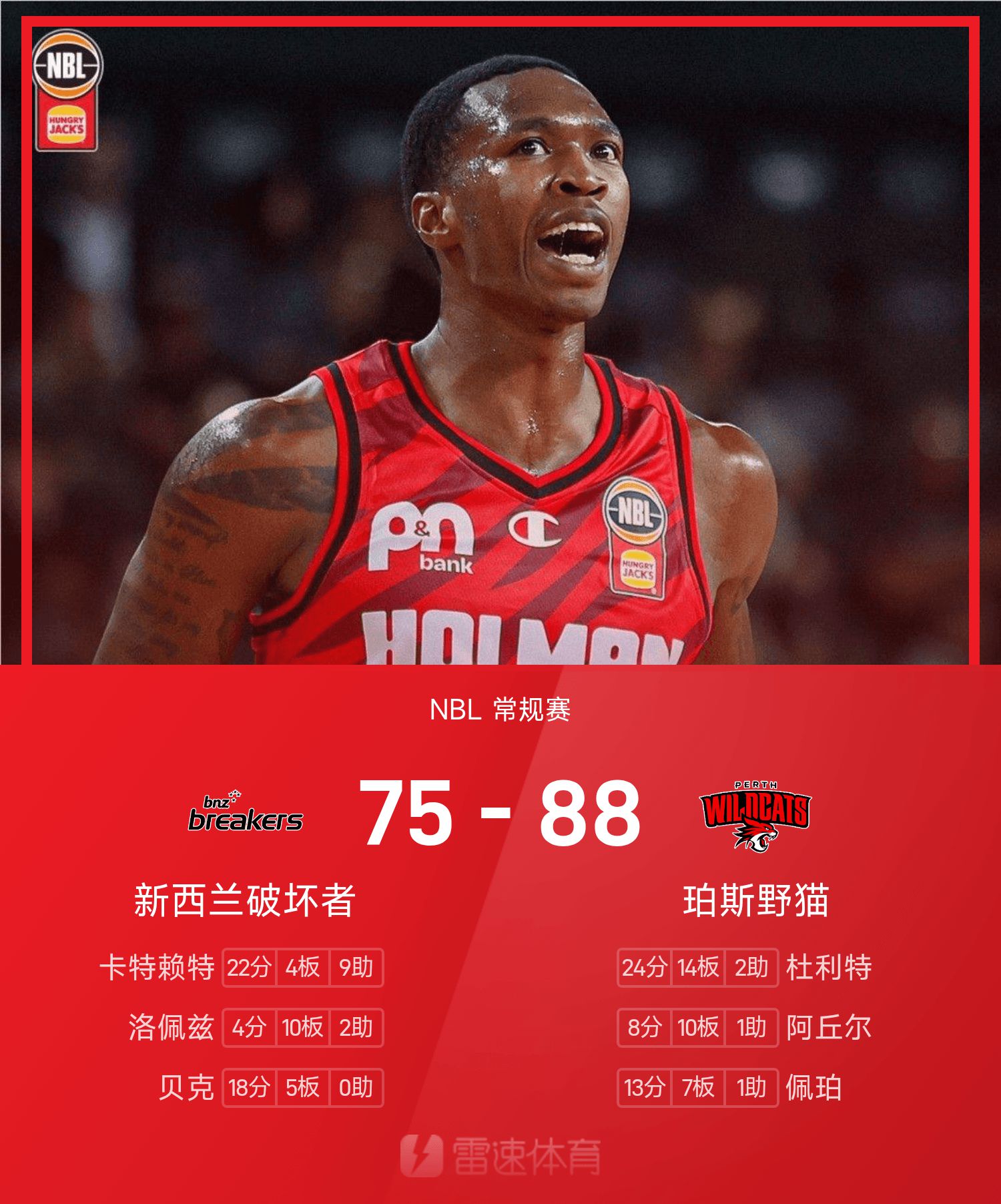 6686体育11月15日讯 25/26赛季NBL 常规赛,珀斯野猫对阵新西兰毁坏者。双方全场战罢,珀斯野猫88-75战胜新西兰毁坏者。杜利特砍下全场最高的24分14板2助,率领珀斯野猫胜利取胜。