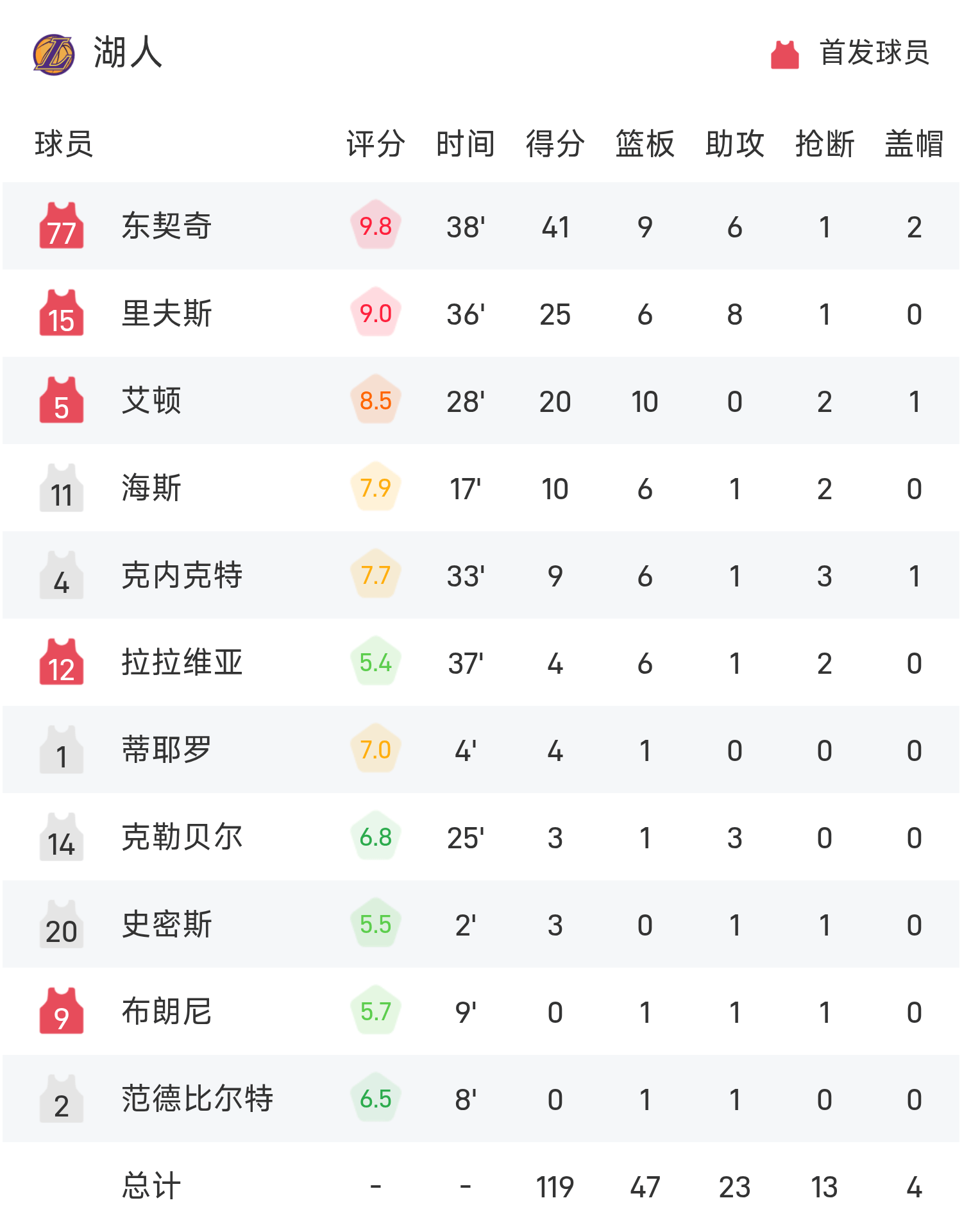 NBA战报:东契奇41分9板6助,字母哥32分,湖人119-95雄鹿