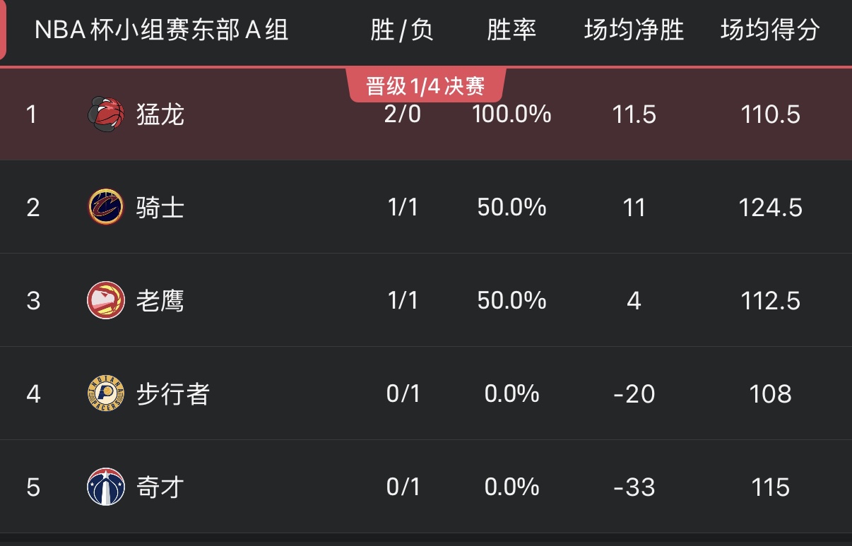东部A组这边,猛龙2胜0负高居榜首,更为主要的是他们在首战击败了骑士与老鹰两支小组直接竞争对手,目前占据了出线的优势。