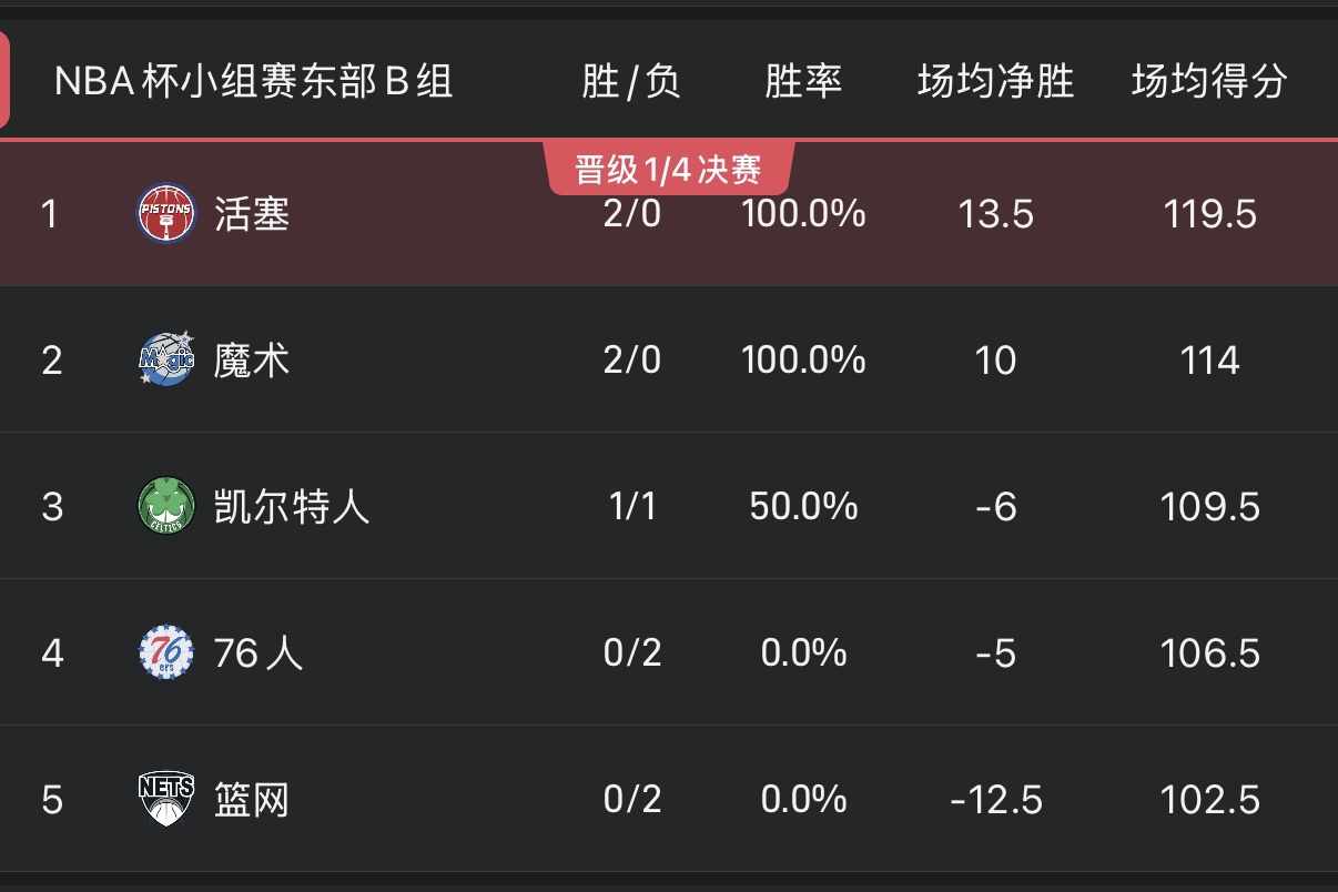 东部B组这边,活塞与魔术同时取得2胜0负的战绩,双方之后还会正面对话一次,而这场竞赛的胜者将会拥有出线的绝对主动权。