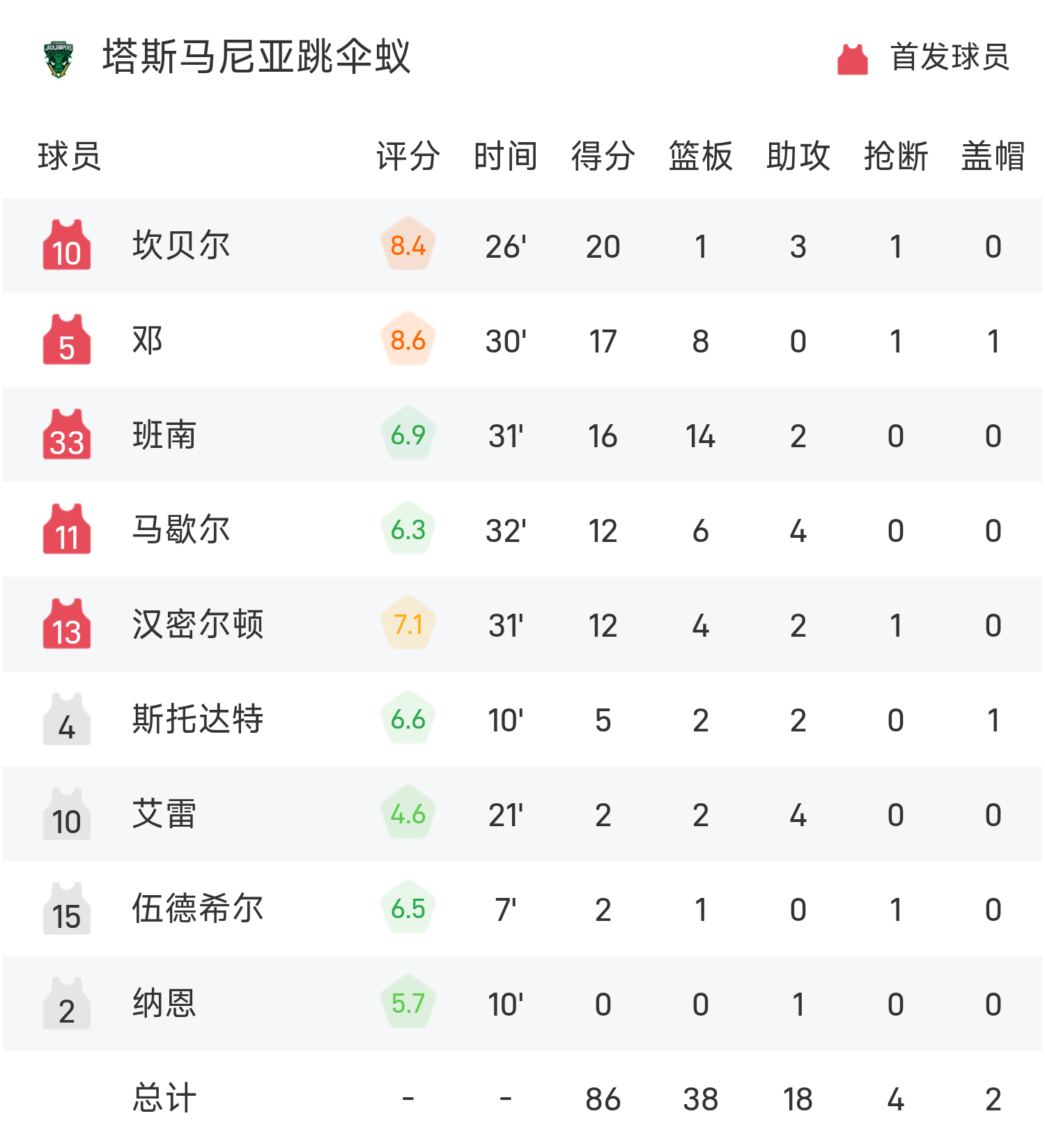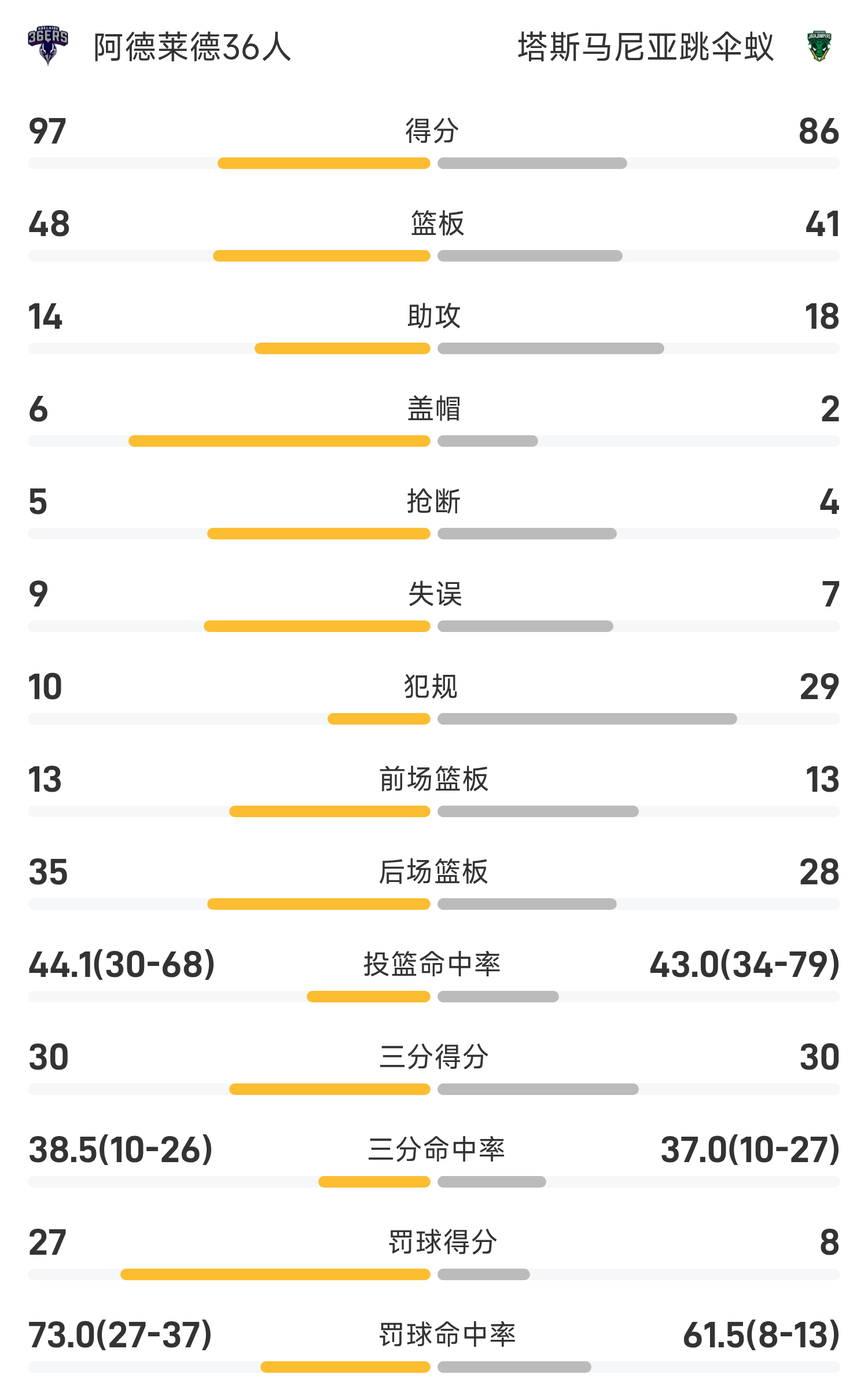 双方全场战罢,塔斯马尼亚跳伞蚁86-97不敌阿德莱德36人。