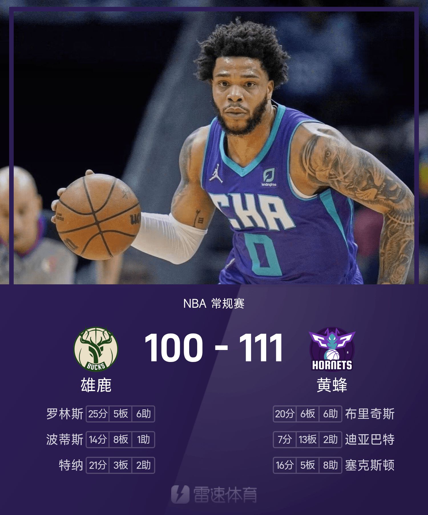 NBA战报:布里奇斯20分6板6助,黄蜂111-100击败雄鹿