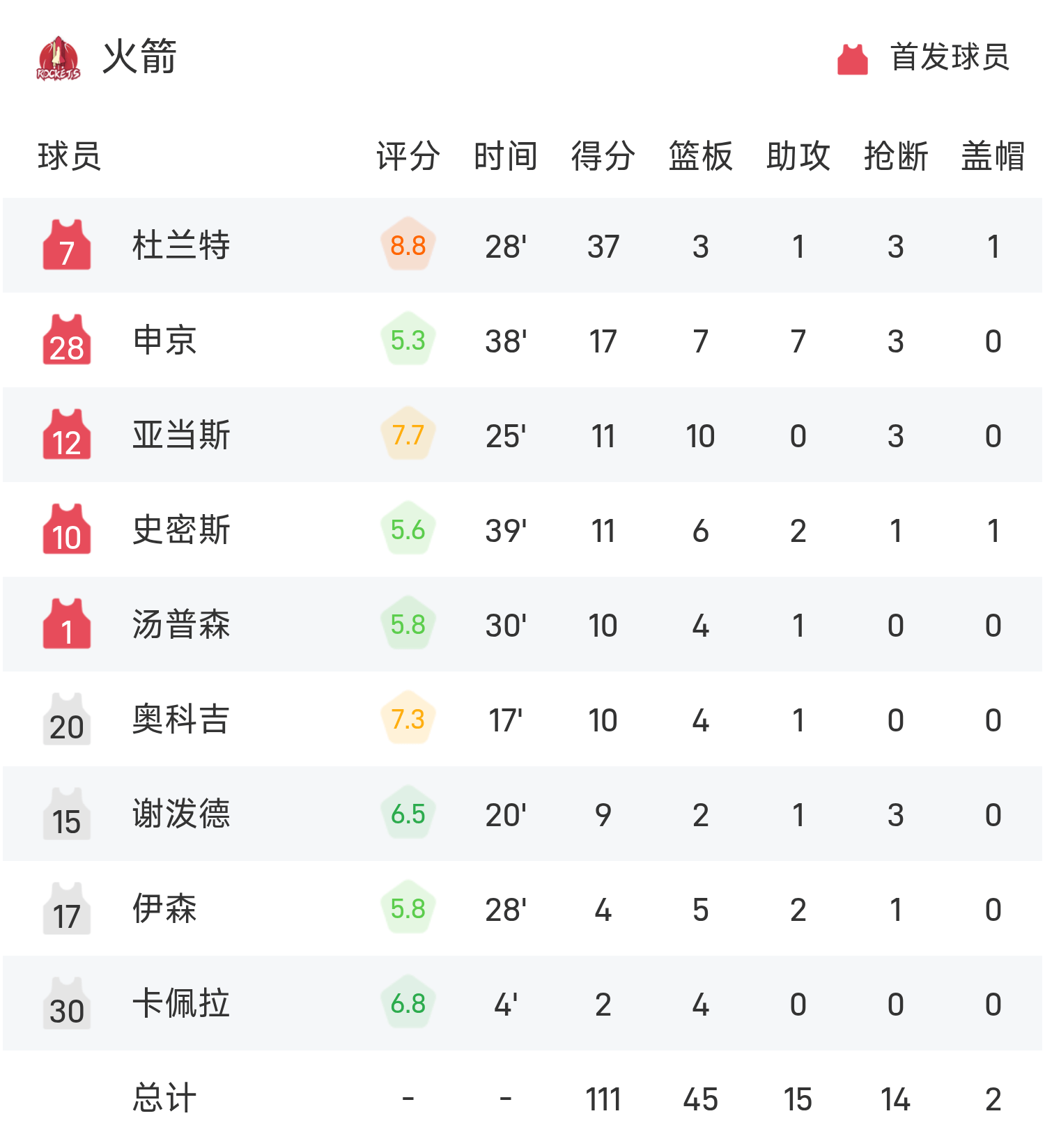 6686体育10月25日讯 25/26赛季NBA 常规赛,火箭对阵活塞。双方全场战罢,火箭111-115不敌活塞。康宁汉姆得到21分7板9助率队取胜,杜兰特空砍全场最高的37分3板1助。