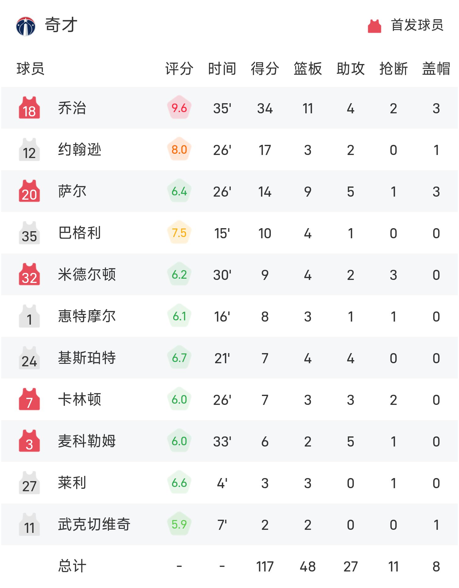 6686体育10月25日讯 25/26赛季NBA 常规赛,独行侠对阵奇才。双方全场战罢,独行侠107-117不敌奇才。乔治砍下全场最高的34分11板4助,率领奇才胜利取胜。