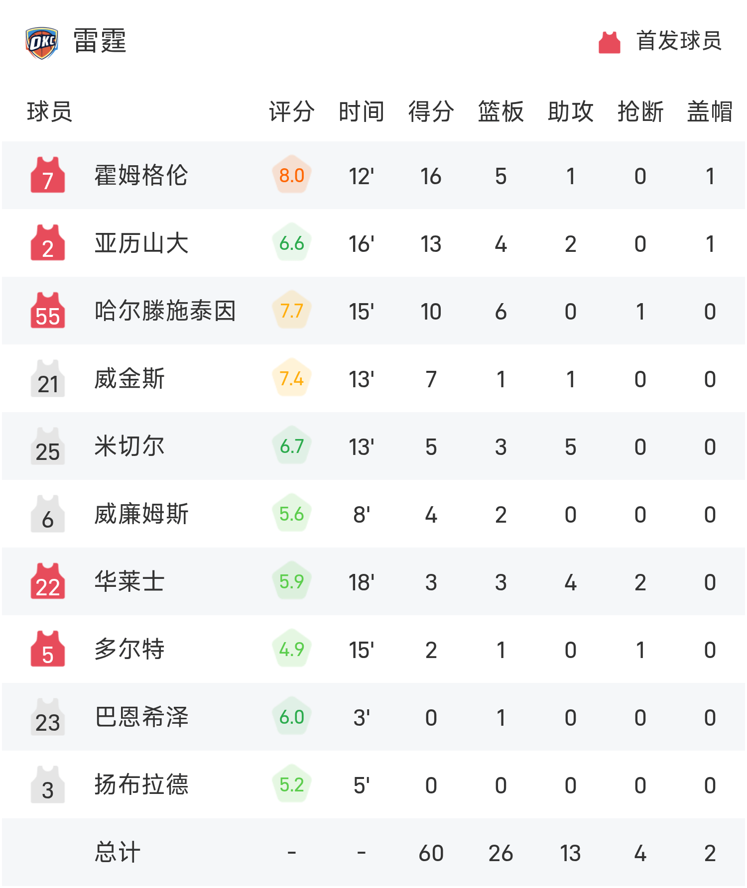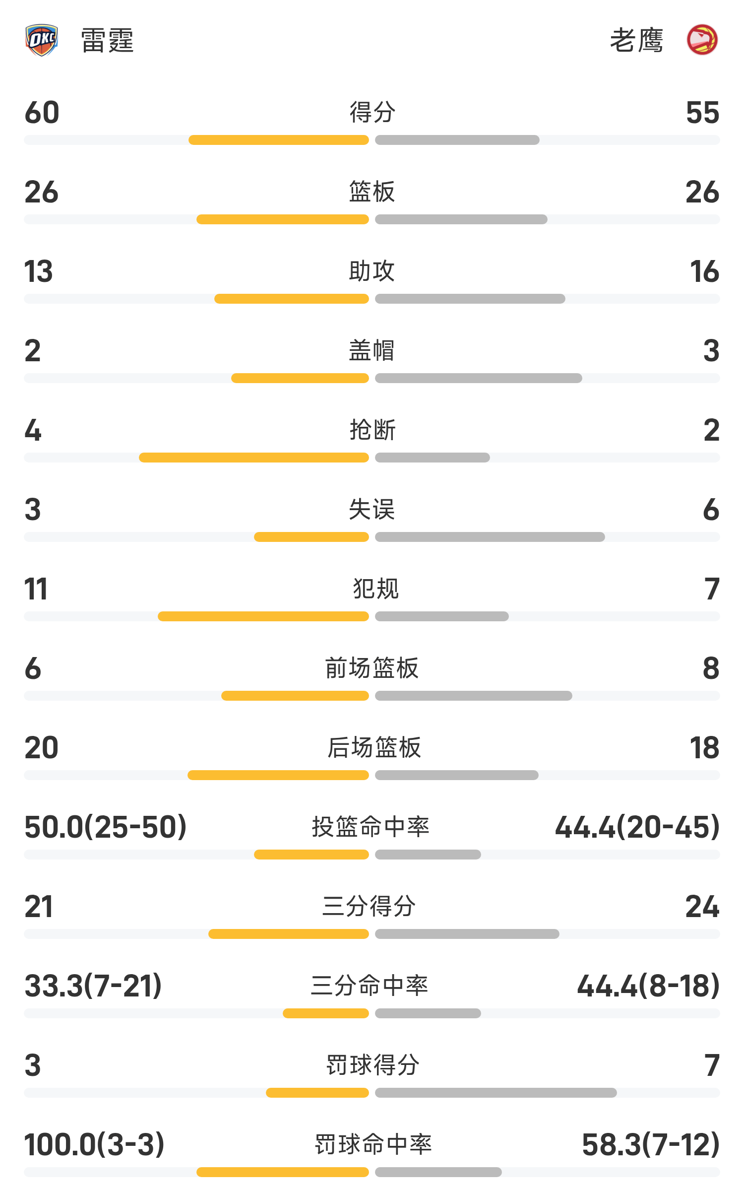 NBA半场:霍姆格伦16分,SGA13分4板,雷霆60-55领跑位老鹰