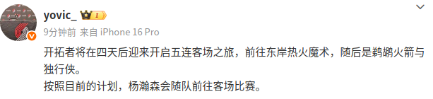 社媒原文:“开拓者将迎来开启五连客队场之旅,前往东岸热火、魔术,随后是鹈鹕、火箭与独行侠。按照目前的计划,杨瀚森会随队前往客队场竞赛。”