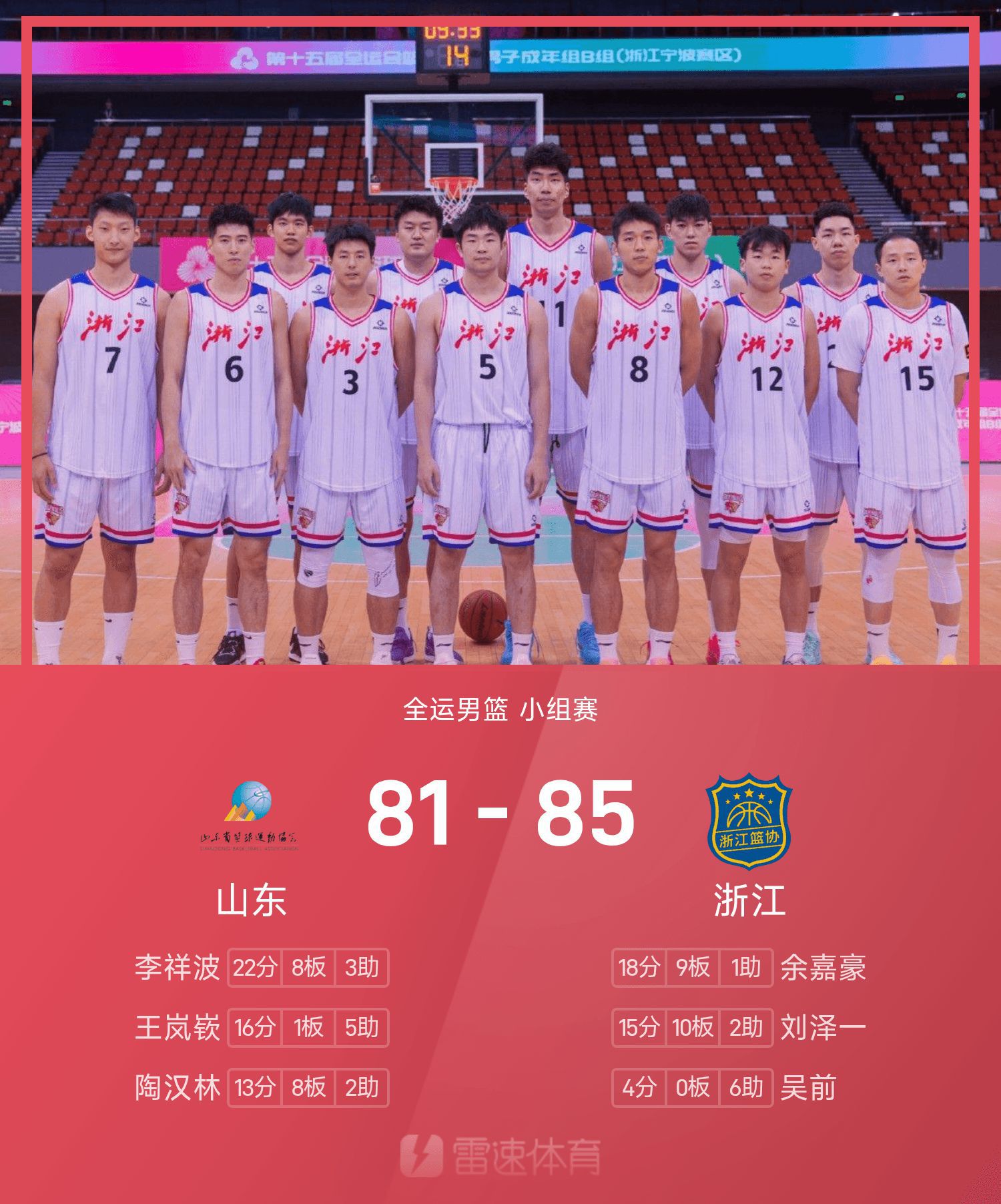 全运男篮战报:余嘉豪18分9板,浙江85-81险胜山东